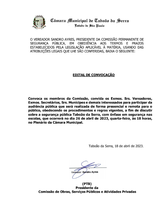 Edital de audiência pública referente à segurança da cidade de Taboão da Serra